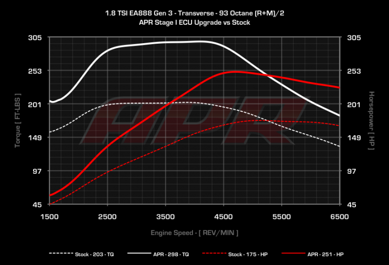 APR Stage 1 úprava Řídící jednotky je jedna z nejlepších úprav v přepočtu ceny na každého přidaného koně pro motor 1,8 TSI. APR Stage I Úprava Řídící jednotky je navržena pro seriový motor bez potřeby dalších mechanických úprav. S pouhou úpravou řídící jednotky, APR kalibrační inženýři naměřili vyšší maximální výkon 244-252 koní a točivý moment 388-390Nm za použití 95-98 oktanového paliva. Velký nárust výkonu a točivého momentu je v celém spektru otáček a dosahuje až +57-65 koní a 131!! Nm.