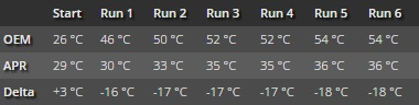 Seriový chladič dosahoval počáteční teploty 26°C, která vystoupala na vysokých 46°C už po první zkoušce. V kontrastu s tím teplota u APR intercooleru vzrostla jen o 1°C! APR intercooler kit se rychle zbavil vstřebaného tepla a na konci posledního měření dosahovala teplota (IAT) 36°C. To je hodnota, se kterou R chladič nedokázal držet krok a