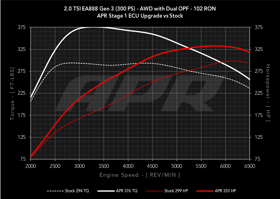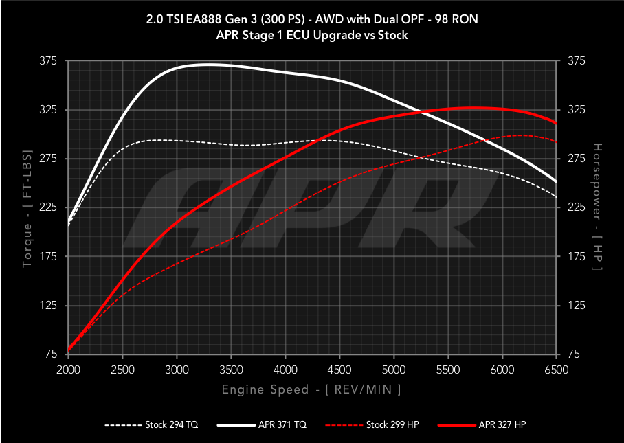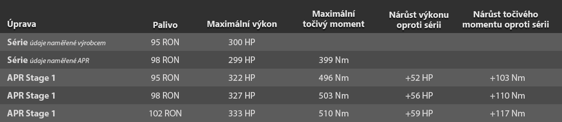 APR Stage 1 úprava řídící je první krok k dosažení vysokého výkonu. Tato jednoduchá úprava nevyžaduje žádné dodatečné hardwarové úpravy na motoru a je dostupná ve výkonech 349-333hp a 496-510Nm v závislosti na oktanové specifikaci použitého paliva, viz grafy níže. Vělký nárust výkonu je dostupný hlavně ve středních otáčkách. To jsou hodnoty, které udělají auto vyjímečně rychlé za všech okolností.