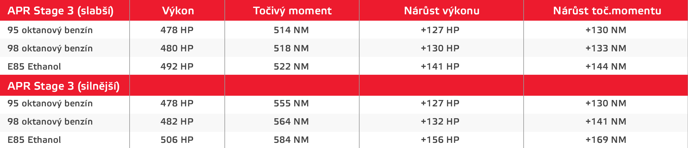 - Zvýšení výkonu na 478-506 hp a 514-584 Nm