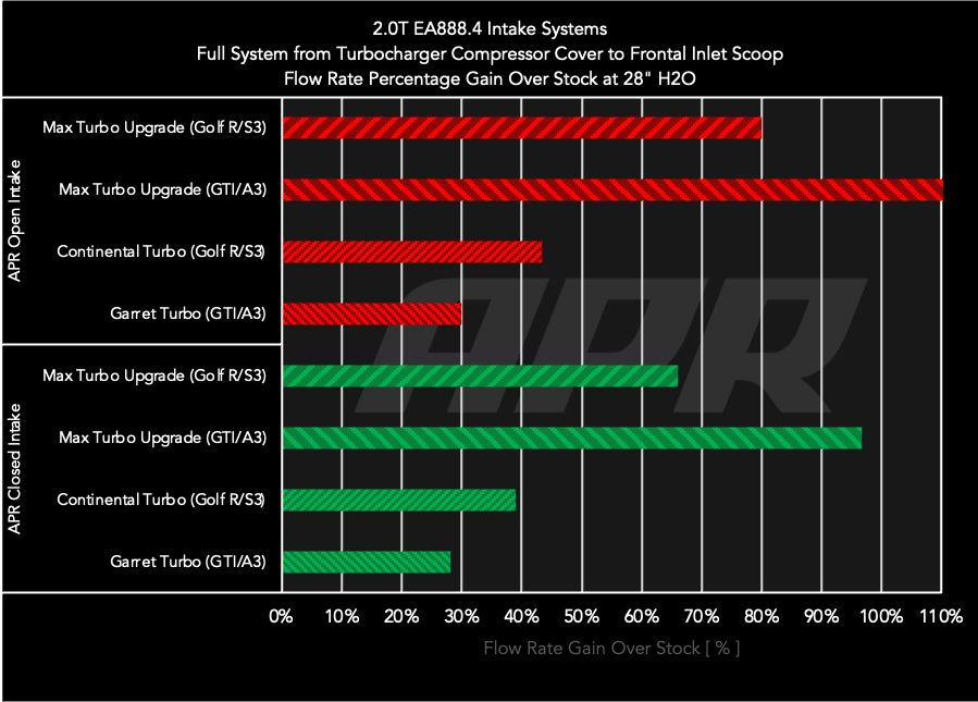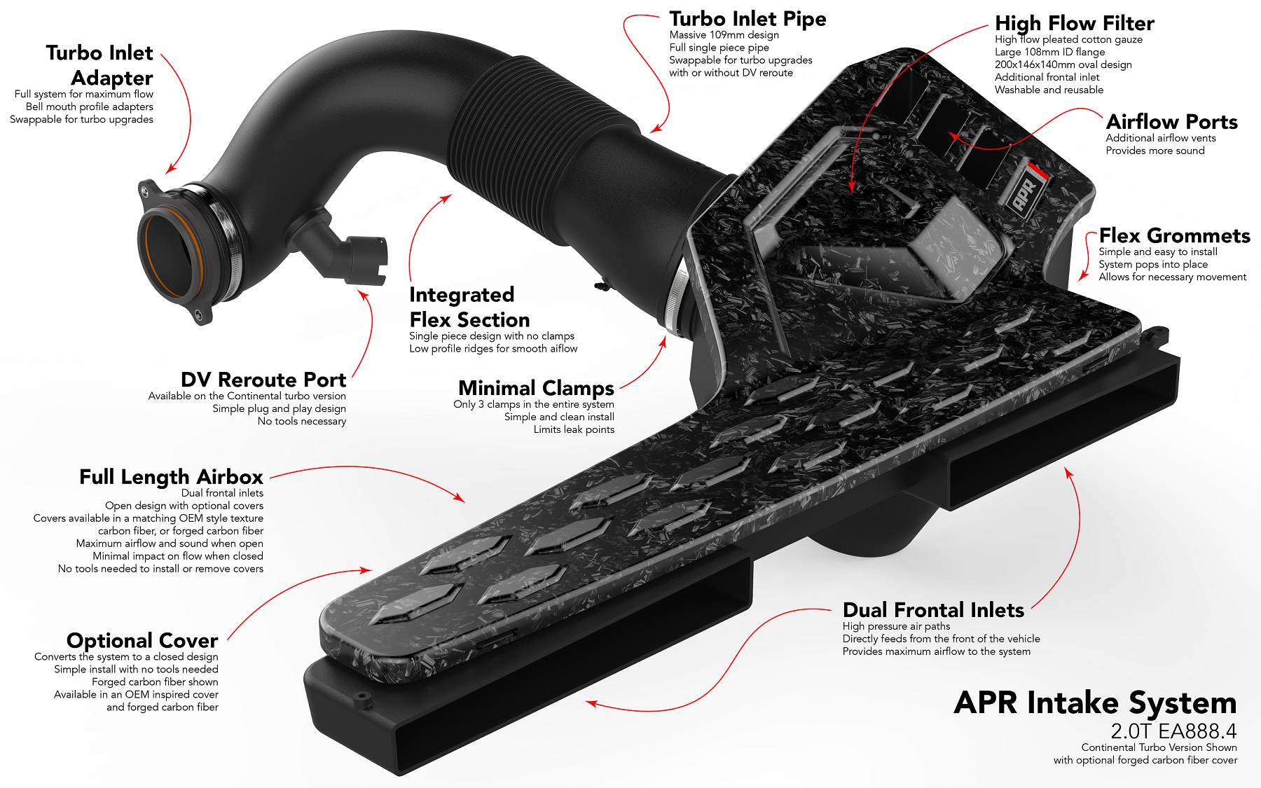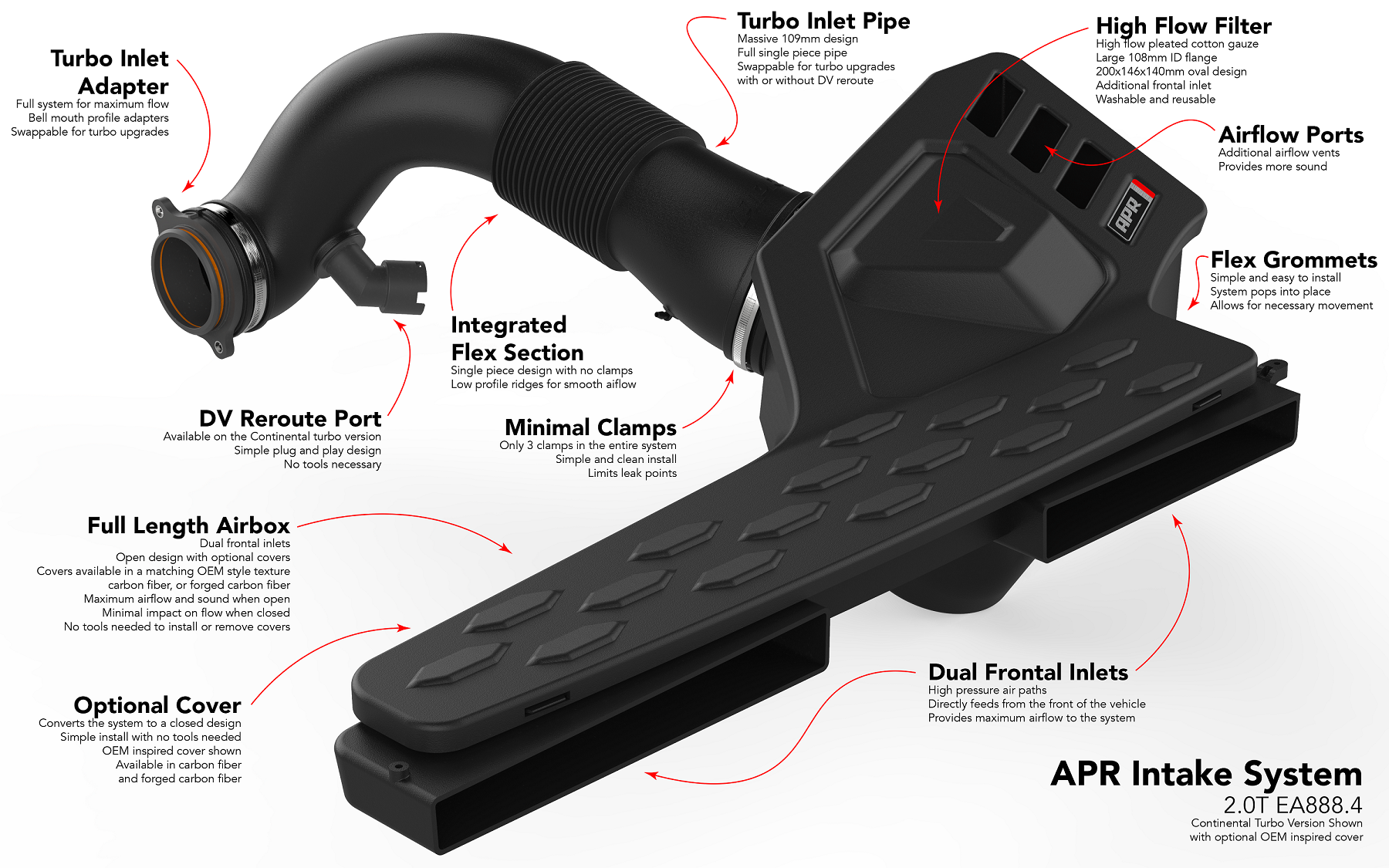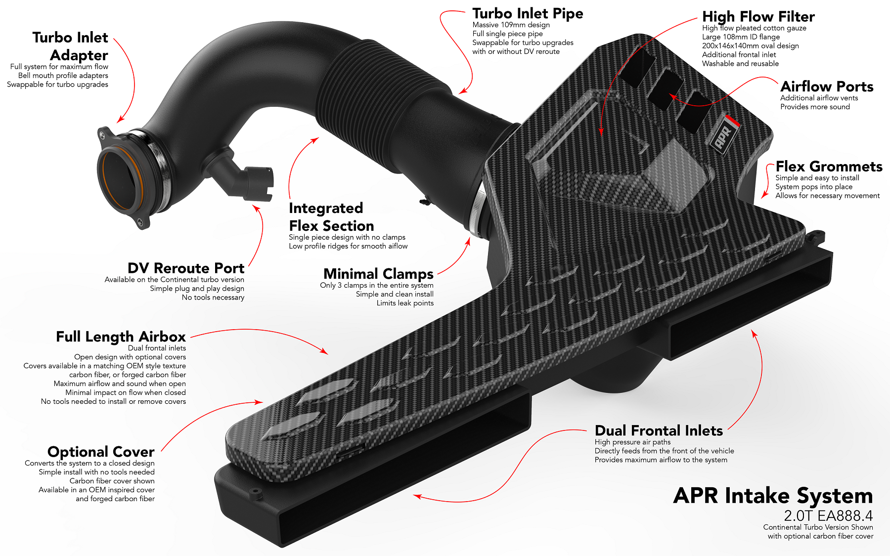 Extrémně propracované modulární sportovní sání pro motor 2.0T EA888.4. Jedná se o revoluční, vysoce výkonné sportovní sání, které obsahuje kompletní vedení vzduchu od přívodů v přední příčce, až po zvětšený vstup do turba s vedením o průměru 109 mm. Systém je plně konfigurovatelný, kdy základní otevřené sání si můžete doplnit o vrchni kryt, který rázem celý prostor kolem vzduchového filtru uzavře a vytvoří tak odcloněné náporovné sání. Kryt je možné vybírat v plastnovém provedení, které nejvíce zapadá do originálního vzhledu motorového prostoru, případně je možné vzhled motorového prostoru vylepšit krytem v provedení klasický pletený karbon nebo dokonce i kovaný karbon. Tyto dva karbonové díly budou navíc perfektně ladit s APR Karbonovým krytem motoru. Filterbox je kompatibilní se všemi verzemi a pokud budete přecházet na větší hybridní turbodmychadlo, pak je možné dokoupit pouze samotný spojovací adaptér u vstupu do turbodmychadla za větší, případně při přechodu na Continental turbo je možné vyměnit pouze vedení vzduchu od filterboxu k turbodmychadlu. APR Kit sání má výrazně vyšší průtok vzduchu jak sériový filterbox, je méně restriktivní s nižší tlakovou ztrátou, zvyšuje výkon a točivý moment, zlepšuje reakce motoru, lépe zní, lépe vypadá, je zcela konfigurovatelný podle vašeho přání a přichází za neuvěřitelně dostupnou cenu. Toto je jediný systém sání, který kdy budete potřebovat!