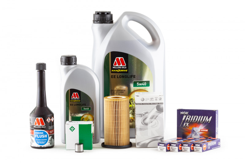 - Servisní set pro motor 2,0 TFSI EA113 s Millers Oils EE Longliefe Nanodrive 5w40 VW 502 00 a Engine Flush, Sportovní zapalovací svíčky, Cam follower a Originální olejový filtr