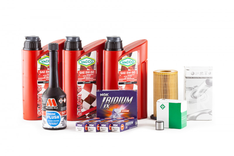 - Servisní set pro motor 2,0 TFSI EA113 s Yacco Galaxie GT 5w50 VW 502 00, Millers Oils Engine Flush, Sportovní zapalovací svíčky, Cam follower a Originální olejový filtr