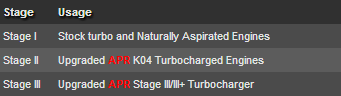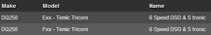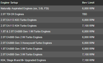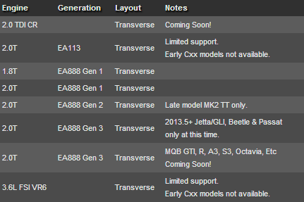 Poznámka: APR úprava je určena pouze pro převodovky s kódem začínající na Exx a Fxx, které jsou ovládány procesorem Temic Tricore. Starší (do 2008) převodovky Cxx, které jsou ovládány Power PC managementem, jako u motorů EA113 s K03 turbodmychadlem a starší 3,2 VR6 se značně liší a prozatím nejsou podporovány.