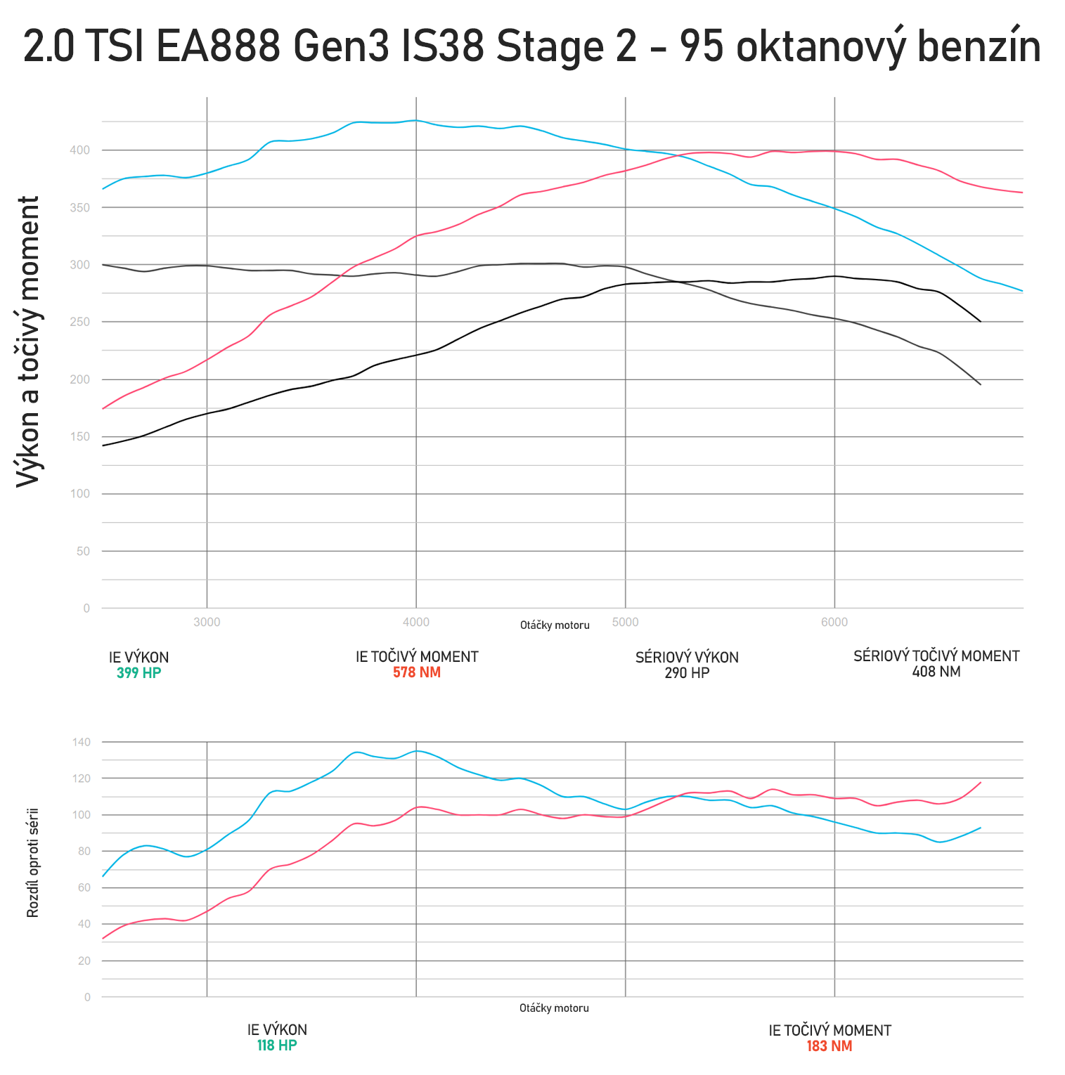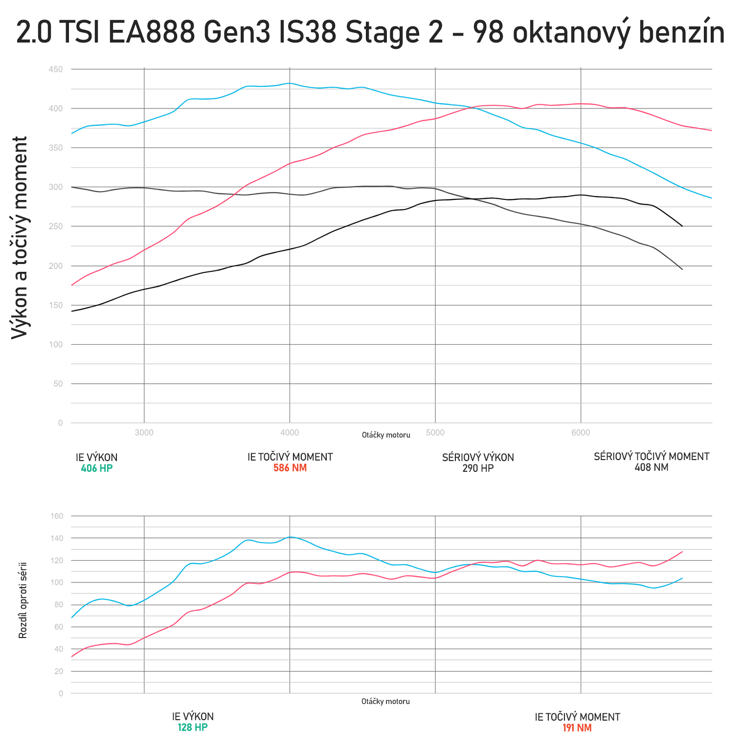 Zvýšení výkonu IE Stage 2 pro motor 2,0 TSI zvyšuje výkon až na 406hp a 586Nm. Jedná se o pokročilejší naladění motoru, které ke svému chodu vyžaduje montáž dalších komponent. Minimální požadavky jsou sportovní první díl výfku (downpipe) a sportovní sání.