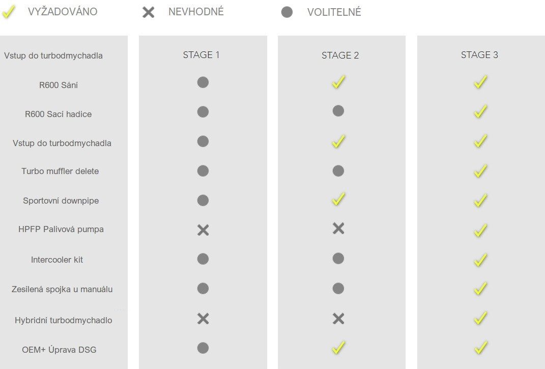 Pro dosažení výkonu Stage 3 úpravy jsou potřeba všechny produkty, které jsou vypsané níže v tabulce.