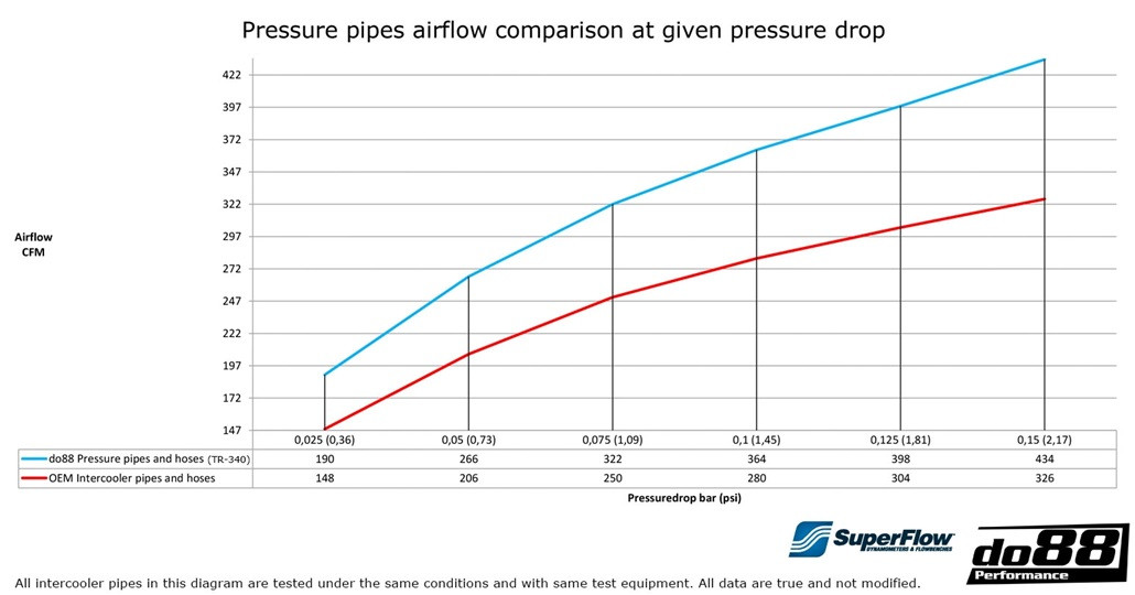 Silikonové hadice vyrobené z kvalitního silikonu pro zajištění maximální odlonosti, trvanlivosti a vzhledu.Hadice jsou zkonstruováné tak, aby vydržely vysoké tlaky a teploty po velmi dlouhou dobu. Ty jsou doplněné o hliníkové vedení s povrchovou práškovou úpravou. To je rozdíl oproti originálnímu restriktivnímu plastovému vedení a originálním gumovým hadicím, která svým průměrem můžou limitovat výkon motoru. Tento set je tak ideální náhradou, která zlepší jak vzhled motorového prostoru, tak i výkon motoru.