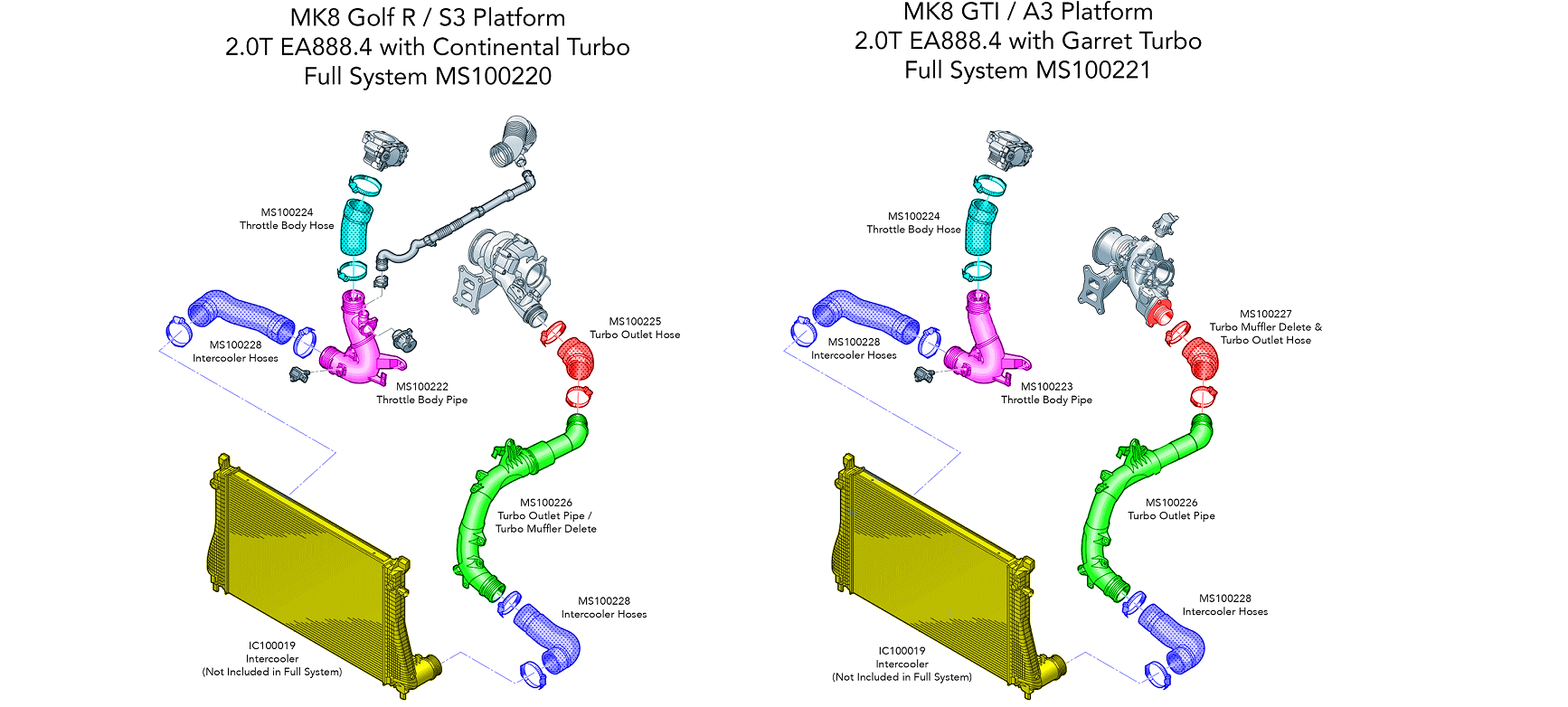 APR kompletní vedení vzduchu od turbodmychadla, včetně Muffler delete pipe, přes kompletní hliníkové tlakové vedení a silikonové hadice, které nahrazuje vše, co je mezi turbodmychadlem a intercoolerem a mezi intercoolerem a škrtící klapkou. Vedení zvyšuje průtok vzduchu skrz tlakové vedení odstraněním restrikcí. Zlepšuje zvuk turbodmychadla, výkon a odstraňuje potenciálně problémové sériové komponenty.
