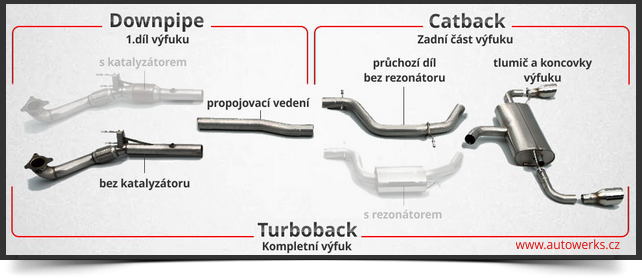 Turboback výfuk - výfuk, který se napojuje přímo na turbodmychadlo. Díky zvětšenému průměru vedení již od turba a sportovnímu katalyzátoru, popřípadě bez katalyzátoru, lze získat z motoru maximální výkon. Zvýrazňuje zvukový projev, zlepšuje výkon motoru a díky nižší váze a jejímu lepšímu rozložení zlepšuje jízdní vlastnosti.