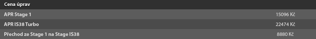 APR úprava Řídící jednotky zvyšuje omezovač rychlosti tak, aby Vás neomezoval při bleskových průjezdech na závodních okruzích nebo na dálnicích, kde by Vás tento limiter mohl dosti omezovat a kazit Vám tak Váš zážitek z jízdy.