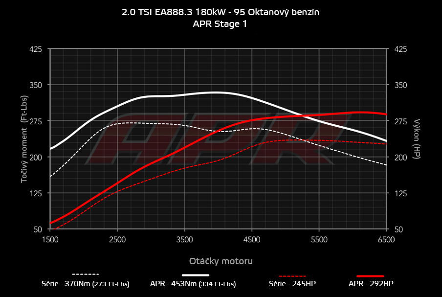 APR úprava řídící jednotky u vozů s pohonem pouze předních kol, neplatí u vozů s pohonem 4x4, přináší nový rozměr v použitelnosti takto výkonných vozů, které disponují náhonem pouze na přední kola. Na první dva převodové stupně je zde omezený točivý moment tak, aby byl vůz vždy na hraně trakce a plný výkon se odemkne až od třetího převodového stupně. To vše s perfektním sladěním s kontrolou trakce ASR. To znamená, že vůz na první tři kvalty zrychluje naprosto lineráně, bez prokluzu předních kol, bez zásahů ASR, které často způsobuje nekomfortní "houpání" vozu v akceleraci. Je zde obrovský posun v životnosti předních pneumatik, jak oproti sériovému vozu, tak hlavně oproti úpravám od veškeré konkurence. APR úprava se může zdát lehce dražší, nicméně rozdíl se rychle obrátí v následných nákladech na nové přední pneu. Hlavně ale získáte vyšší výkon na vyšší kvalty, kde je to potřeba, kultivovanější chod s lepším průběhem výkonu a lepším dávkováním výkonu skrze upravený chod plynového pedálu. Ten nyní zabírá lineárně a s větší, nicméně stále komfortní, citlivostí. K úpravě na přání zdarma vypínáme problematický "Start stop".