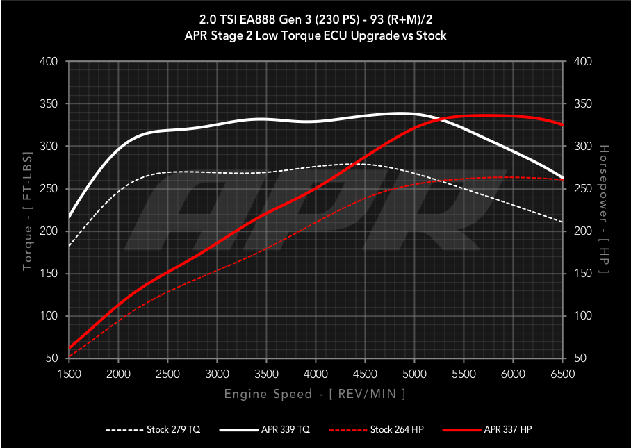 APR úpravy řídící jednotky jsou dostupné v několiká fázích (stageích), které jsou kalibrované pro různé druhy paliva a jak pro seriový motor, tak i pro motor s různými hardwarovými modifikacemi. Úprava je kalibrovaná pro hladký chod jak s DSG převodovkou, tak samozřejmě i s manuální převodovkou. Pokročilé optimalizace řídící jednotky jsou kalibrované pro použití s APR FWD Cast Downpipe výfukovým systémem, APR FWD Cast Downpipe výfukovým systémem a s IS38 Turbodmychadlem. Všechny úpravy jsou kompatibilní pro případné použití lepšího APR karbonového sání vzduchu, APR Vstupu do turbodmychadla, intercooleru (chladiče stlačeného vzduchu), Catback výfuku popřípadě i pro další menší úpravy, které Vám rádi doporučíme. Základní APR Stage 1 úprava je nabídnuta i ve verzi se sníženým točivým momentem a výkonem, která je určena pro zachování maximální životnost seriové spojky u manuální převodovky.