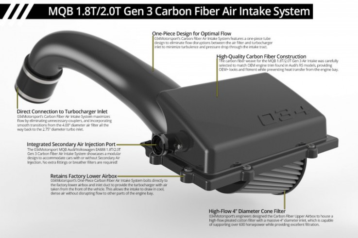 Inženýři u 034Motorsport věnovali velké úsilí a čas ve vývoji kompletního řešení sportovního sání pro nové motory 1,8 & 2,0 TSI, které zprostředkovává reálný nárůst výkonu a točivého momentu oproti seriovému, relativně dobře navrženému airboxu. Během vývoje bylo vyrobeno několik prototypových variant, které byly důkladně odzkoušeny a upravovány až ke konečnému nejlepšímu řešení, kterým je toto elegantní celokarbonové sání.