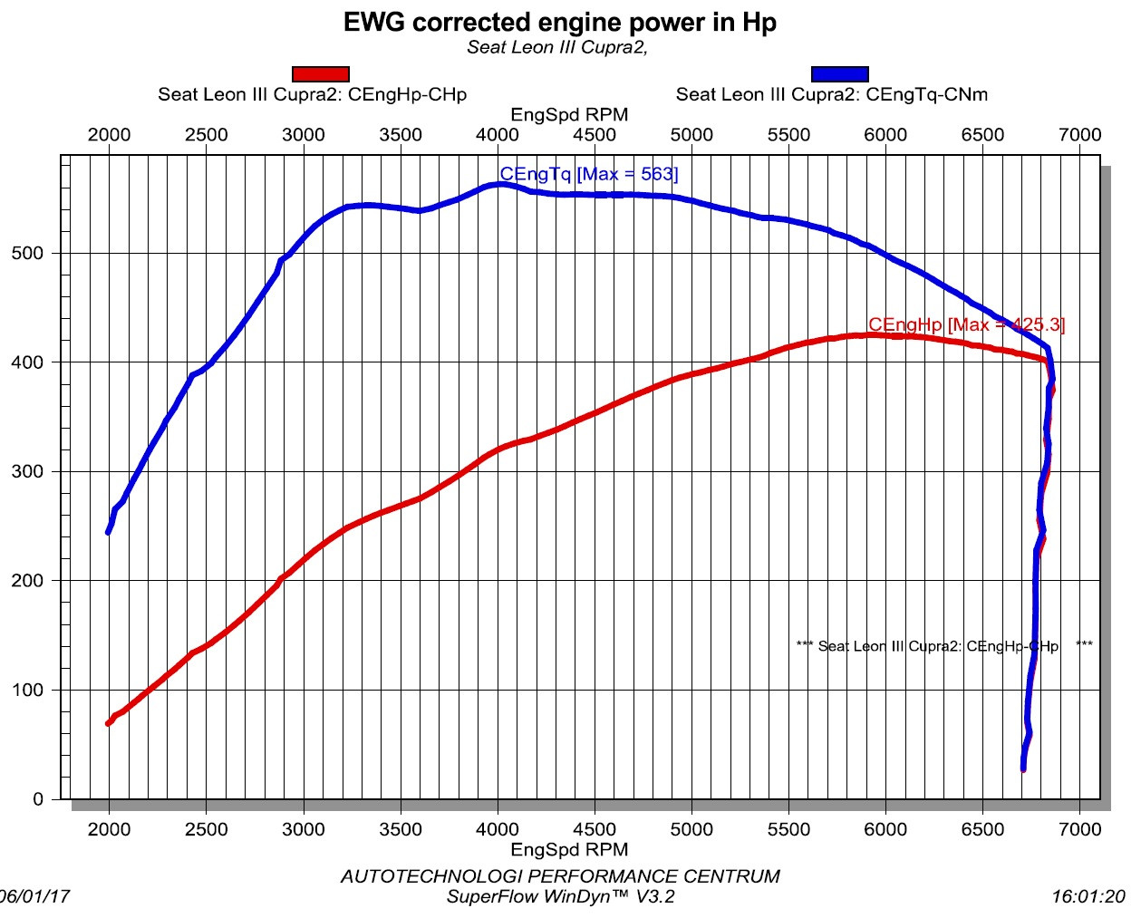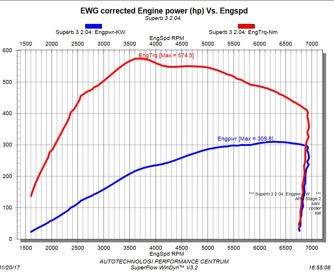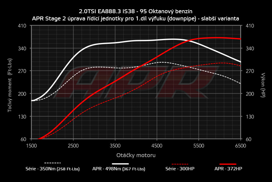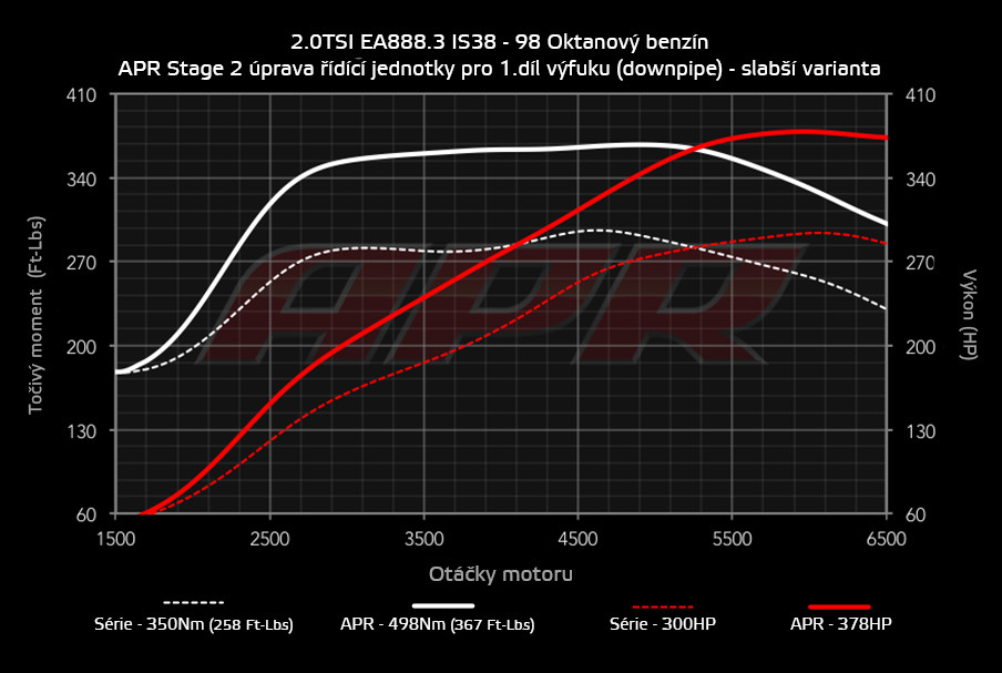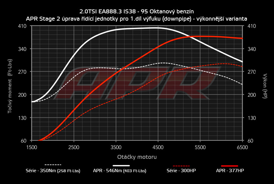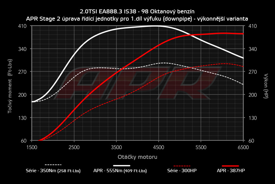 *Měřeno na APR vlastním Dynapack Dynamometru na US 2016 VW Golf MK7 R DSG, za použití SAEJ1349 korekce a zprůměrování několika měření. Výsledky se můžou lišit podle klimatických podmínek, jiných druhů převodovek, kondice auta, teploty, kvality paliva, druhy výkonové brzdy a jejího nastavení a díky dalším vlivům.