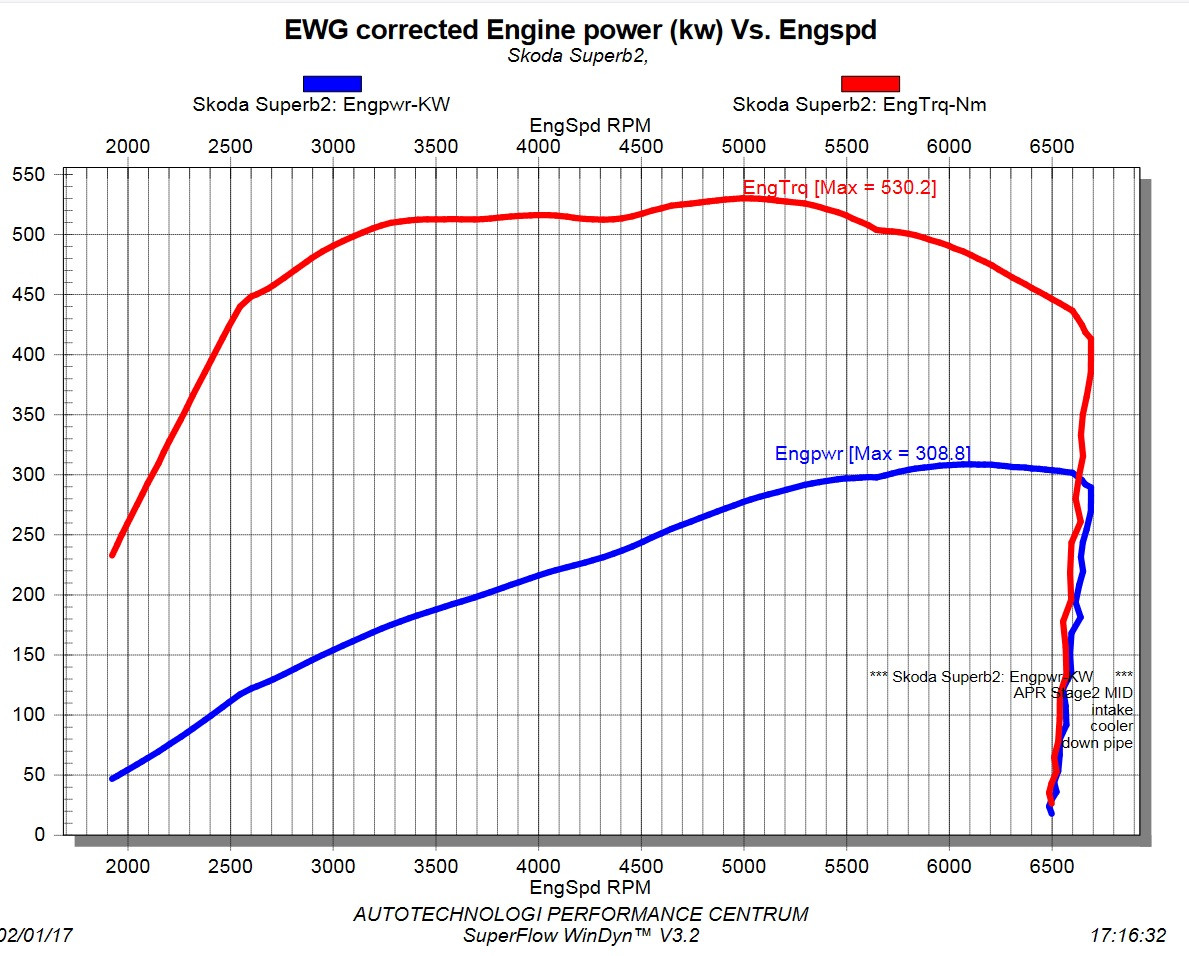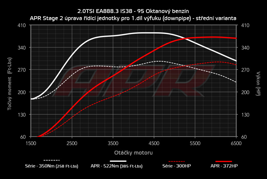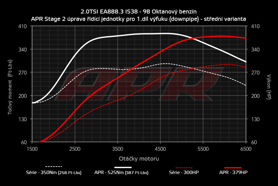 APR Stage 2 úprava řídící je další krok k dosažení vysokého výkonu. Tato úprava vyžaduje dosazení Sportovní první díl výfuku / Downpipe a je dostupná ve výkonech 372-387hp a 497-554Nm v závislosti na zvolené verzi APR Stage 2 úpravy a oktanové specifikaci použitého paliva, viz grafy níže. Nárust výkonu 82-104hp a 111-170Nm je dostupný ve středních a vyšších otáčkách. To jsou hodnoty, které auto udělají vyjímečně rychlé za všech okolností.
