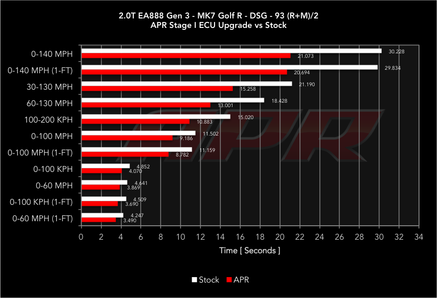 Výsledky byly ohromující. Jednoduchá úprava řídící jednotky u VW Golf 7 R DSG na APR Stage 1, udělala toto auto ve všech ohledech s velikým rozdílem rychlejší. Z 0-100km/h tak upravený Golf 7 R akceleroval za 4s a zrychlení z 50ti km/h na 210 km/h zvládl o 5,9s rychlejí! Testy akcelerace probíhaly až do rychlosti 225 km/h, které bylo s upraveným Golfem 7 R dosaženo o masivních 9,1s dříve než se seriovým vozem.