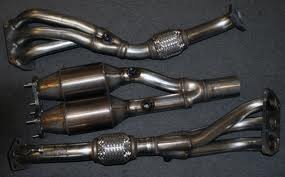 Výfukové svody s katalyzátory. Díl, který se napojuje přímo na hlavu válců a z druhé strany se k němu připojuje catback výfuk
