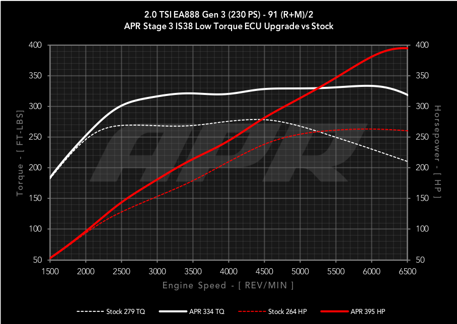 APR Stage 3 IS38 úprava řídící jednotky je další krok k dosažení vyššího výkonu. Tato úprava vyžaduje dosazení dalších potřebných komponent, jako jsou originální IHI IS38 Turbodmychadlo, APR Kompletní sání, APR Intercooler kit a produkuje 339-349hp a 457-516Nm v závislosti na oktanové specifikaci použitého paliva, viz grafy níže. Tato úprava je nabízena ve dvou výkonnostních verzích a to verze s nižším točivým momentem a ve verzi s vyšším točivým momentem.