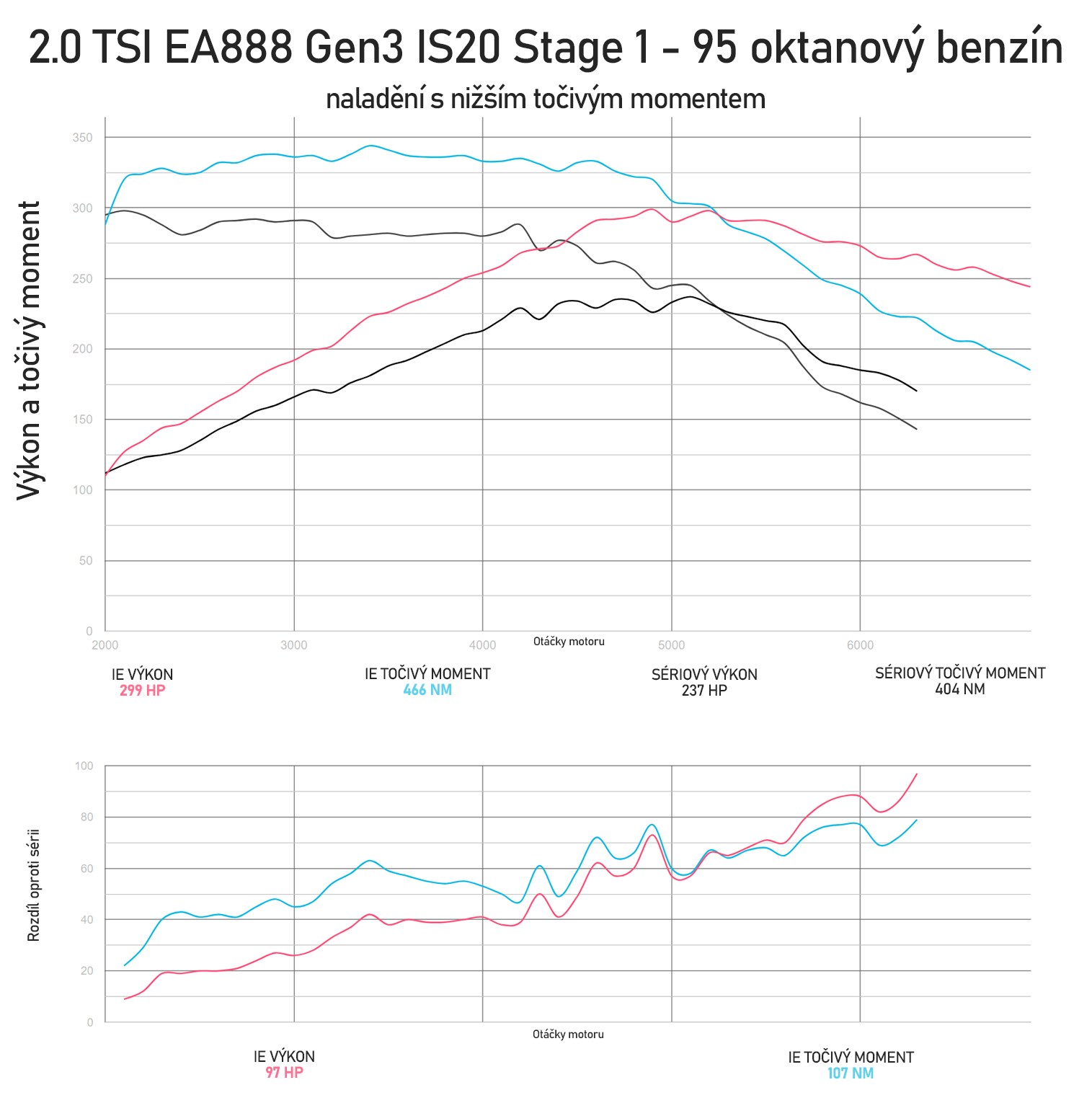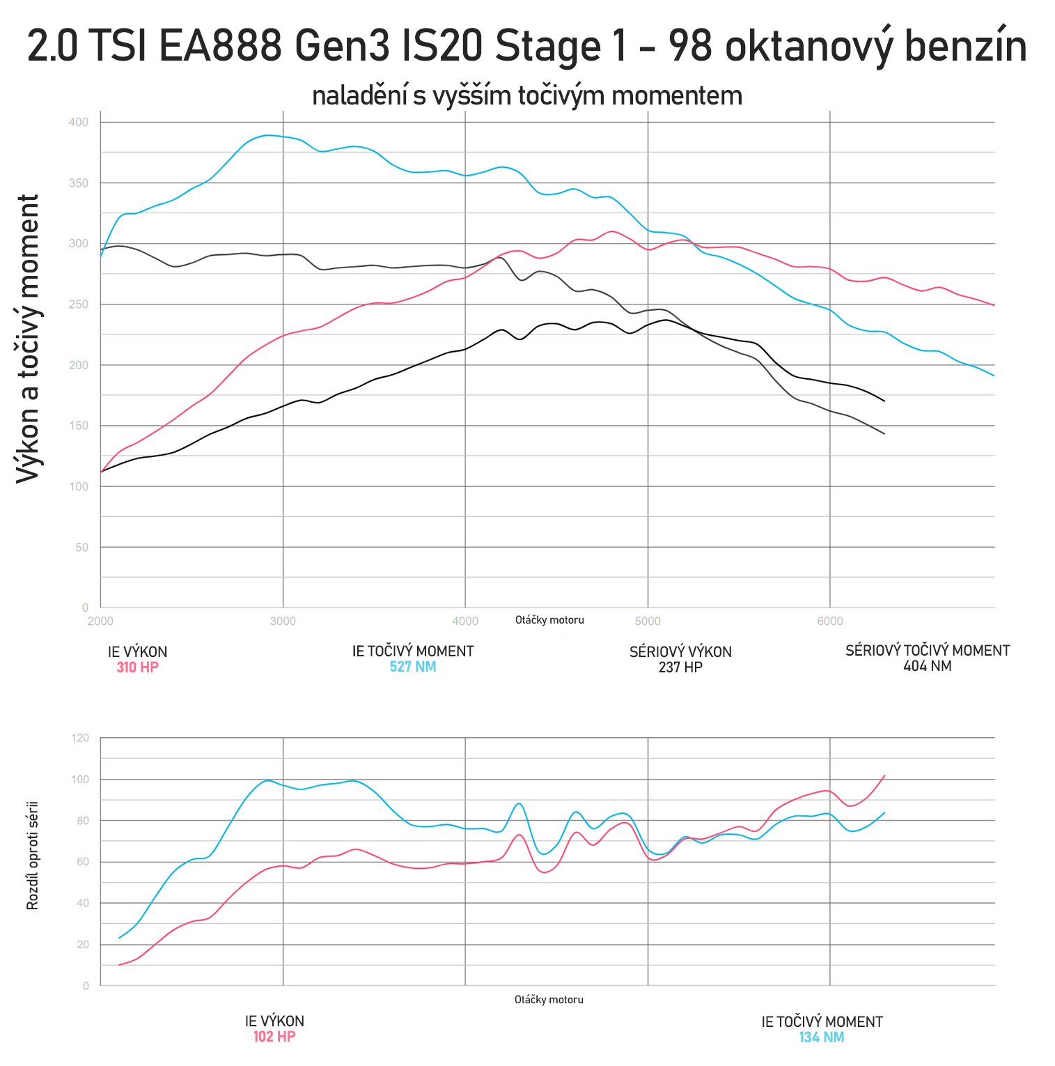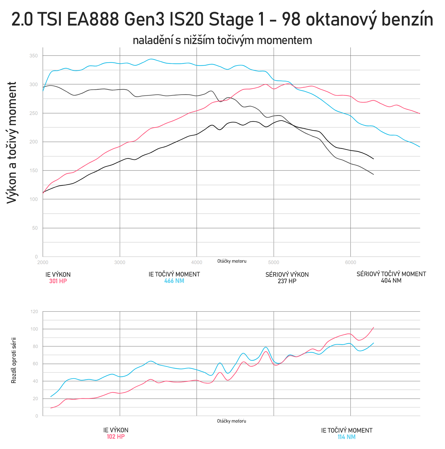 Zvýšení výkonu IE Stage 1 pro motor 2,0 TSI zvyšuje výkon až na 310hp a 527Nm. Pro tento výkon není potřeba dalších dodatečných dílů a provádí se přehráním map skrz OBD zásuvku do originální řídící jednotky motoru.