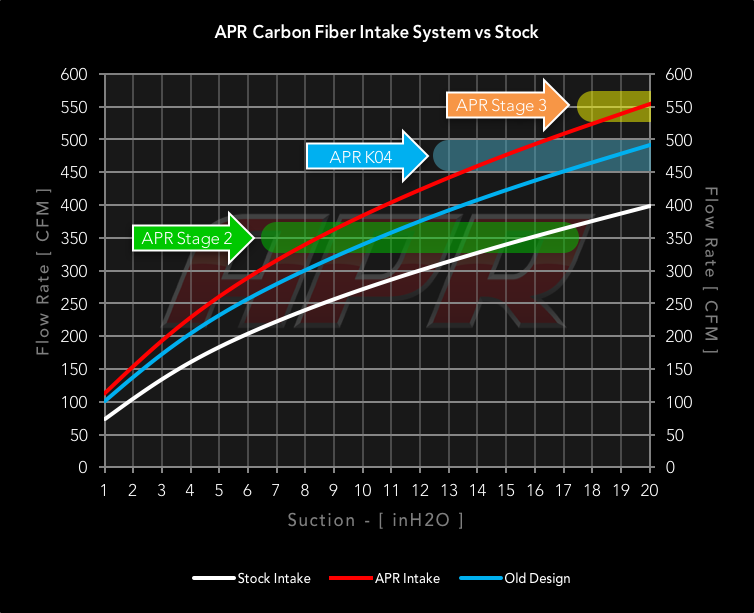 Jak je vidno na tabulce, APR sání výrazně překonává seriový sací trakt v průtoku vzduchu. Tento trend se zvyšuje, čím vyšší je výkon. APR sání je u APR Stage 2 úpravy o dobrých 50% méně restriktivní, oproti seriovému a dokonce i mimo měřené hodnoty u zvýšení výkonu s K04 turbodmychadlem a u Stage 3 kitu. Dosazením APR sportovního sání se nebude tolik zatěžovat turbodmychadlo, sníží se teplota nasávaného vzduchu a je možné očekávat zvýšení výkonu o 15 koní u seriového turbodmychadla.