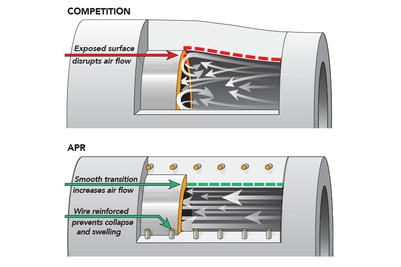APR Easy-Flow design silikonových hadic se vyznačuje schodovým tvarem v místě napojení, aby se docílilo hladkého přechodu mezi jednotlivými díly vedení. Běžné hadice se napojují navlečením na pevné vedení, což vytváří turbulentní a restriktivní vedení. Použtím schodového tvaru, hadice padnou přesně na pevné vedení a vytváří tak přímé bez restriktivní vedení, které je ideální pro proudění vzduchu z turbodmychadla do motoru.