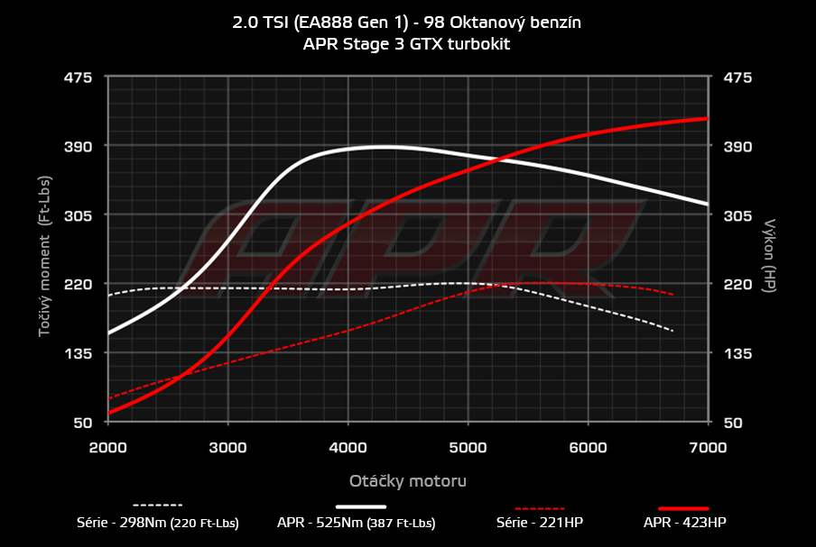 APR s potěšením představuje kompletní Stage III GTX turbokit pro motor 2,0 TSSI EA888 gen1. Produkující více jak 409-423hp na běžný 95-98oct benzín. APR Stage III GTX turbokit posouvá akceleraci motoru 2,0 TSI do stejné ligy s exotickými supersporty s cenouvkou přes 4 miliony Kč.