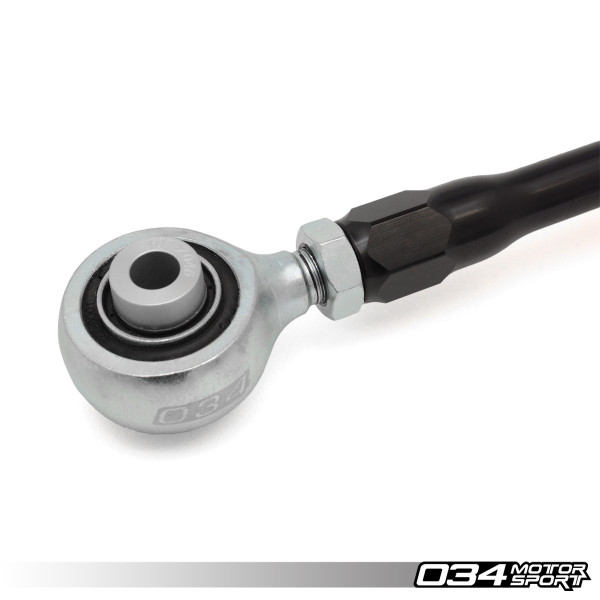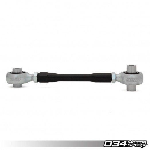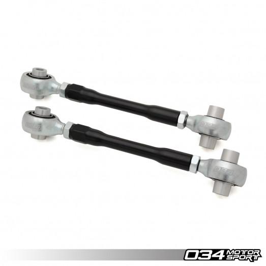 Originální plechová zadní ramena nedovolují přesné štelování sbíhavosti, čímž nenabízí pokročilé možnosti nastavení geometrie podvozku. 034motorsport zadní ramena nabízejí možnost jednoduše nastavitelné geometrie, která se díky robustnímu mechanismu nastavení nebude deformovat při ostré jízdě s lepivými pneu na okruhu. Navíc je spojení na obou stranách provedeno s tvrdšími silentbloky (90 durometrů), které zamezují deformaci v uložení. Tím se dále zlepší zpětná vazba a konzistence nastavení geometrie v náročných podmínkách.