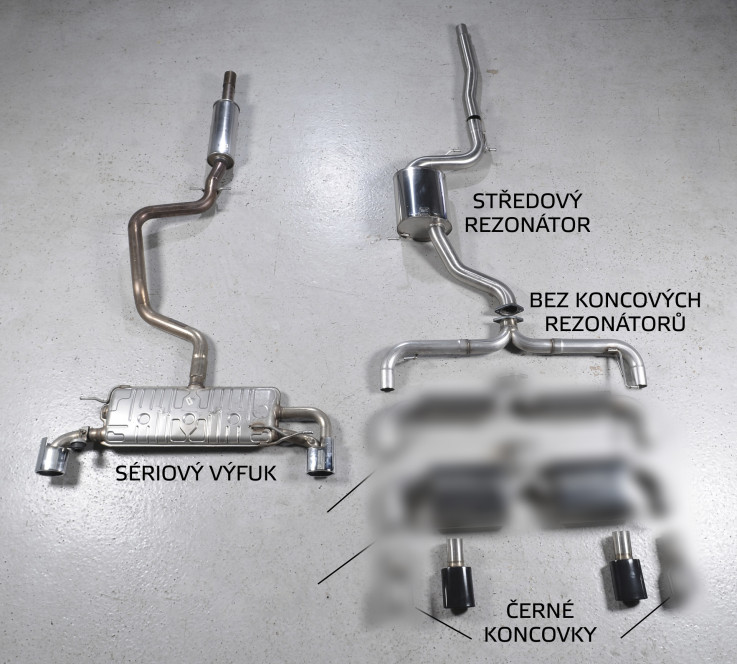 2) 1. odlitý díl s Race katalyzátorem, bez zadních rezonátorů, černé oválné koncovky výfuku