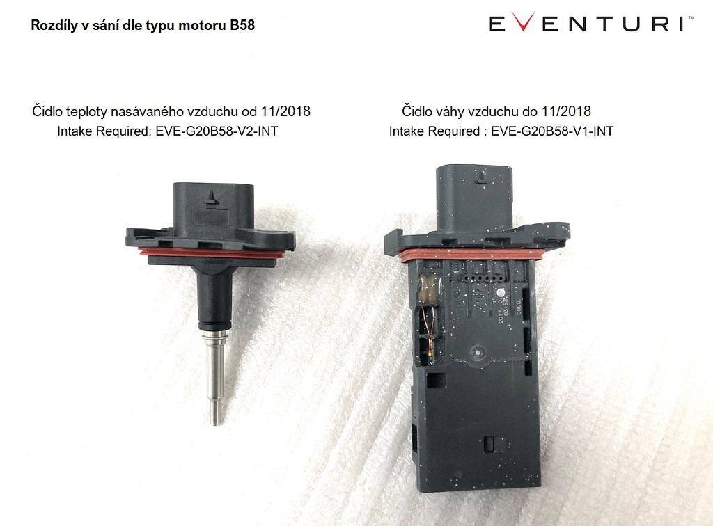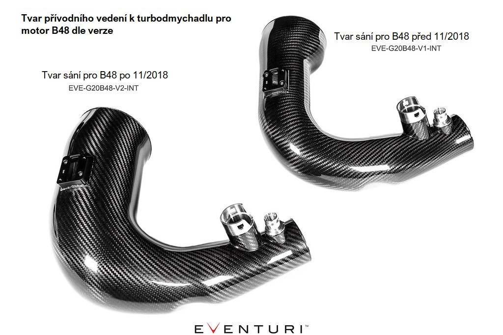 Originální sání BMW pro motory B48 bylo v listopadu 2018 upraveno a původní snímač množství nasávaného vzduchu byl nahrazen teplotním senzorem umístěným v sací trubici. Eventuri nabízí sání pro obě varianty. Sání V1 obsahuje přírubu určenou pro snímač množství nasávaného vzduchu, zatímco sání V2 má přírubu pro teplotní snímač (pro vozy vyrobené po listopadu 2018). Rozdíl mezi trubicemi je viditelný na obrázku níže: