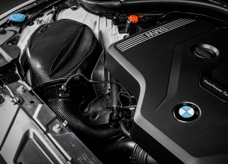 Eventuri kit sání pro BMW řady 3 a 4 G20/22 s motorem B48 je dalším z kompletních systémů vedení nasávaného vzduchu do motoru. Jedná se o kompletně uzavřený kit sání, který zajišťuje, že turbodmychadlo nenasává horký vzduch z motorového prostoru. Celé sání je navrženo tak, aby přivádělo vzduch do motoru co možná nejméně restriktivní cestou. Protože je sání umístěno v blízkosti výfukových svodů, je pro jeho funkci zcela zásadní přívod čerstvého vzduchu, který spolu s airboxem z prepreg karbonu udržuje teplotu nasávaného vzduchu na minimální možné úrovni. Kromě továrního přívodu vzduchu využívá Eventuri další zdroj v podobě otvoru v podběhu kola. Proti výfukovým svodům pak míří i tepelný štít se zlatou reflektivní tepelnou izolací.
