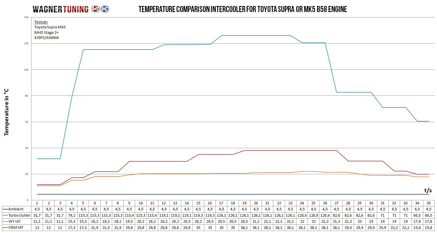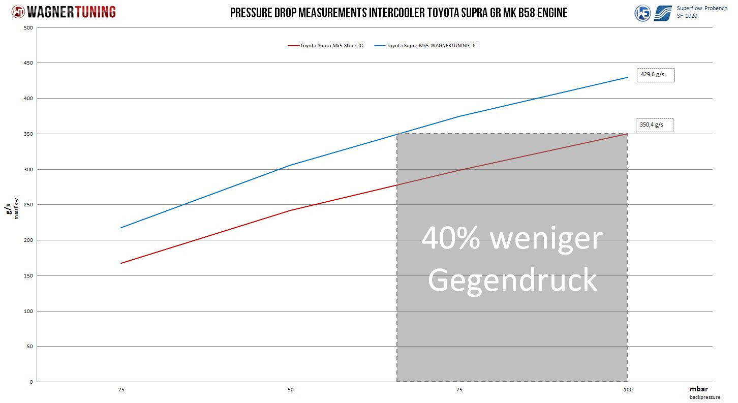 Vysoce výkonný mezichladič WAGNERTUNING dostal nové větší výkonné jádro chladiče. Toto jádro mezichladiče bylo vyvinuto přímo pro vysoké požadavky motoru B58 a nabízí o 128 % větší vnější objem jádra ve srovnání se sériovým mezichladičem. Vypočítaný poměr mezi vnitřní a vnější chladicí plochou vytváří maximální přenos tepla a zároveň nejlepší možné vnitřní proudění vzduchu. Hliníkové lité koncové nádrže byly navrženy v CAD a optimalizovány v CFD simulacích. Výsledkem jsou vynikající chladicí vlastnosti s minimálním protitlakem. Proto je tato sada ideální i pro závodní použití. Optimální chladicí účinek stlačeného vzduchu s výrazným zvýšením výkonu!