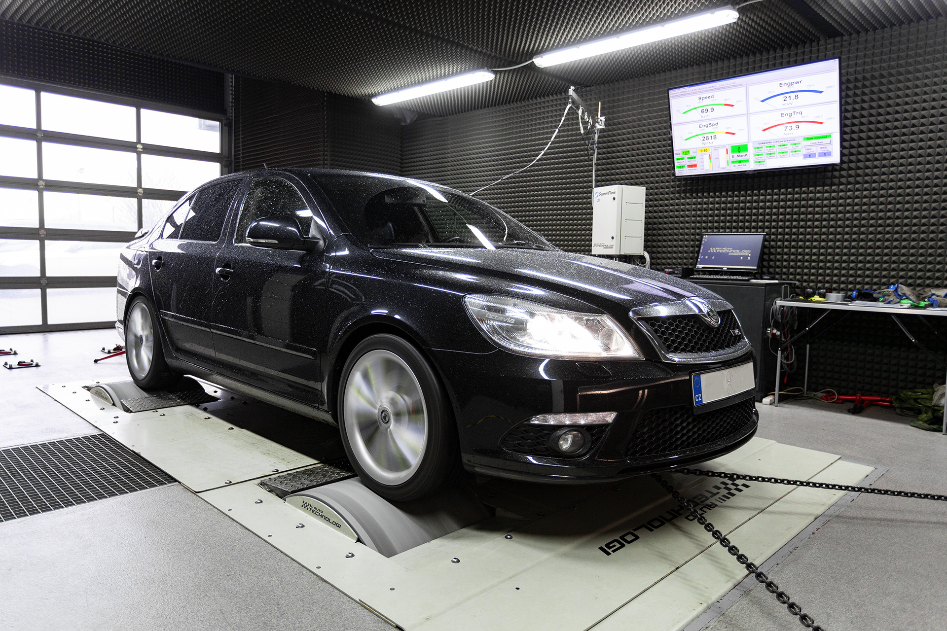 Přistoupilo se tedy k další fázi, kdy se udělala kompletnější úprava a dosadilo se sportovní sání od Racingline Performance, intercooler kit do88, kompletní výfuk Milltek Sport a vedení vzduchu od CTS Turbo. K těmto dílům jsme udělali upgrade naladění řídící jednotky na fázi APR Stage 2 a získali tak již zmiňovaný výkon 288hp a 437Nm. Auto výrazně ožilo a aby tomu stačil i podvozek, tak se dosadily sportovní pružiny a stabilizátory od ST Suspensions, sportovní silentbloky přední nápravy od SuperPro a větší přední brzdy z Octavie 3 RS 340x30mm s Clubsport kotouči a destičkami pro lepší brzdný účinek.