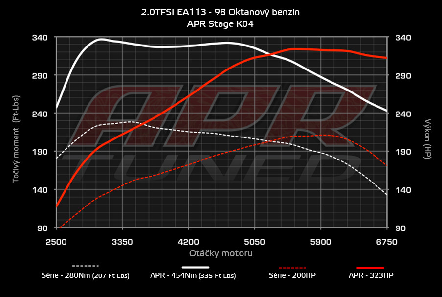 APR K04 upgrade je pokročilá úprava řídící jednotky, která vyžaduje montáž několika potřebných dílů. Tím hlavním je větší K04 Turbodmychadlo, ke kterému jsou potřeba Originální vstřikovače z AUDI S3, Lepší vysokotlaká palivová pumpa, První díl výfuku a Sportovní sání (doporučujeme sání od Racingline Performance). Pro dosažení maximálního výkonu je třeba dosadit i lepší intercooler a ideálně i odstranit vířivé klapky v sání.